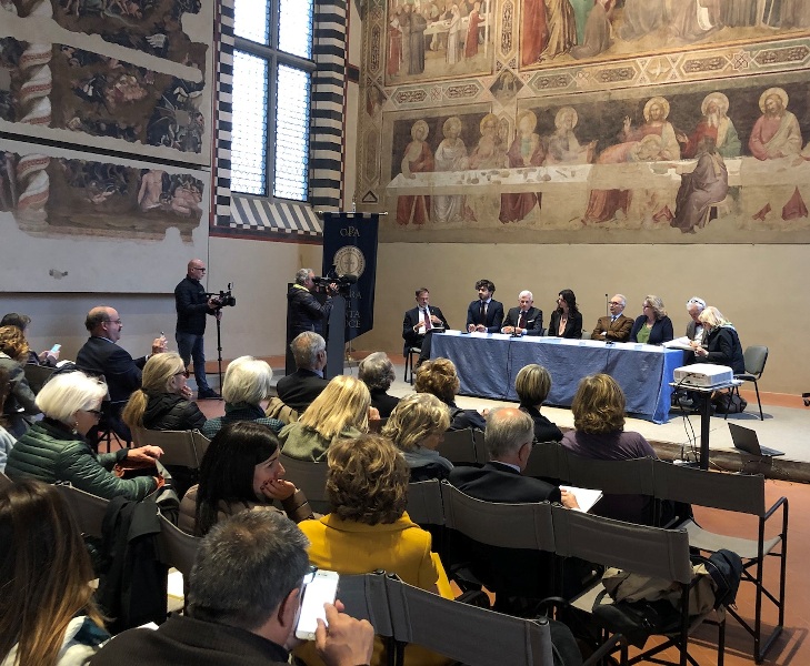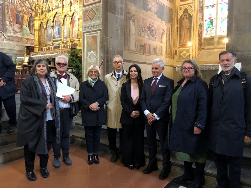 Alla presenza del viceprefetto Ugo Righini del Fondo Edifici di Culto del ministero dell’Interno, proprietario della basilica, il progetto viene presentato questa mattina da Irene Sanesi, presidente dell’Opera di Santa Croce, da Marco Ciatti, soprintendente dell’Opificio delle Pietre Dure, da Claudio Paolini della Soprintendenza Archeologia, Belle arti e Paesaggio per la Città metropolitana di Firenze, con Tommaso Sacchi, capo segreteria Cultura del Comune di Firenze, insieme ai sostenitori del restauro: Dominique Marzotto Desforges e Gian Antonio Golin, rispettivamente presidente e direttore di ARPAI, e Donatella Carmi, vicepresidente della Fondazione CR Firenze.