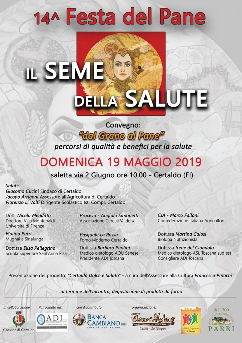 Questo il programma: saluti del Sindaco di Certaldo, dell’Assessore all'Agricoltura, del Dirigente scolastico dell’Istituto Comprensivo di Certaldo, Fiorenzo Li Volti. Seguiranno gli interventi di Nicola Menditto Direttore Villa Montepaldi Università di Firenze; Angiolo Simonetti, Proceva - Associazione Cereali Valdelsa; Marco Failoni, Confederazione Italiana Agricoltori; Molino Parri, Mugnai a Sinalunga; Pasquale La Rossa, Forno Moderno Certaldo; Martina Calosi, biologa nutrizionista; Elisa Pellegrino, Scuola Superiore Sant'Anna Pisa; Barbara Paolini, Medico dietologo AOU Senese Presidente ADI Toscana; Irene del Ciondolo, medico dietologo ASL Toscana sud est, Consigliere ADI Toscana.