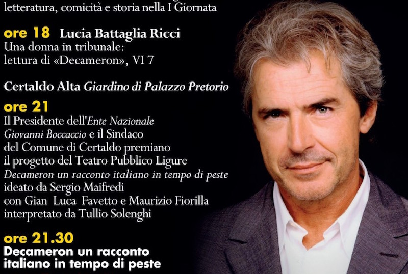 Causa maltempo lo spettacolo di Tullio Solenghi "Decameron, un racconto italiano in tempo di peste", in programma oggi, venerdì 17 maggio, alle ore 21.00, si terrà al Teatro Multisala Boccaccio, via del Castello, 2, invece che nel giardino di Palazzo Pretorio come inizialmente previsto.
