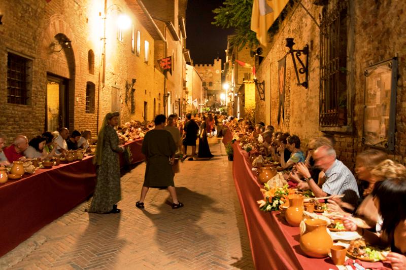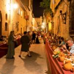 “Si tratta di una cena suggestiva, basata su piatti e sapori medioevali, allestita con posti a sedere su due lunghissime tavole ai lati della Via Boccaccio che per l’occasione sarà illuminata da torce – spiega Grazia Palmieri, presidente di Elitropia – una rievocazione di una perfetta cena a partire dai piatti tipici dell’epoca, al servizio a tavola composto da piatti di coccio e posateria in legno in omaggio ai commensali. Le pietanze saranno servite da oltre 80 figuranti vestiti in costumi medievali. Nell’intervallo tra le varie portate, allieteranno la serata gli spettacoli di duelli di spada, mangiatori di fuoco, trampolieri a cura della Compagnia del Drago Nero, gruppo spettacolare di Certaldo ormai conosciuto in tutta Italia. Al termine della cena un meraviglioso spettacolo pirotecnico sullo sfondo di Palazzo Petrorio. La cena medievale, giunta alla sua 18a edizione, lo scorso anno ha visto quasi 500 commensali, provenienti da tutta Italia, partecipare alla manifestazione ogni sera. Ringraziamo gli abitanti di Certaldo Alto per la collaborazione, ma anche i panifici, le pasticcerie ed i fiorai di Certaldo per la loro collaborazione”.