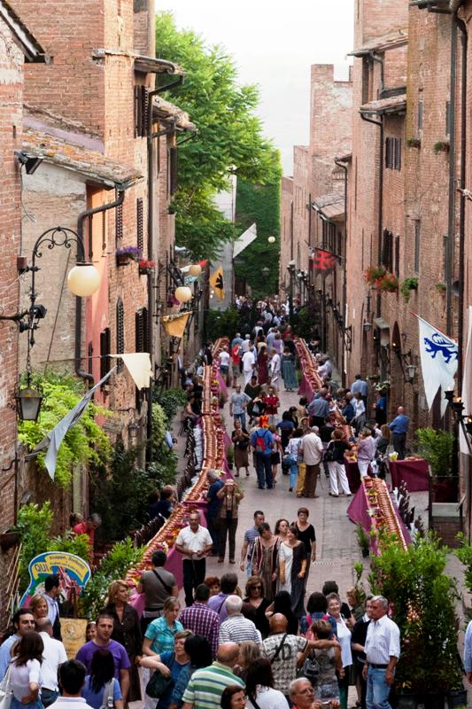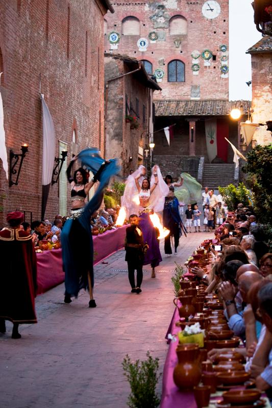 “Si tratta di una cena suggestiva, basata su piatti e sapori medioevali, allestita con posti a sedere su due lunghissime tavole ai lati della Via Boccaccio che per l’occasione sarà illuminata da torce – spiega Grazia Palmieri, presidente di Elitropia – una rievocazione di una perfetta cena a partire dai piatti tipici dell’epoca, al servizio a tavola composto da piatti di coccio e posateria in legno in omaggio ai commensali. Le pietanze saranno servite da oltre 80 figuranti vestiti in costumi medievali. Nell’intervallo tra le varie portate, allieteranno la serata gli spettacoli di duelli di spada, mangiatori di fuoco, trampolieri a cura della Compagnia del Drago Nero, gruppo spettacolare di Certaldo ormai conosciuto in tutta Italia. Al termine della cena un meraviglioso spettacolo pirotecnico sullo sfondo di Palazzo Petrorio. La cena medievale, giunta alla sua 18a edizione, lo scorso anno ha visto quasi 500 commensali, provenienti da tutta Italia, partecipare alla manifestazione ogni sera. Ringraziamo gli abitanti di Certaldo Alto per la collaborazione, ma anche i panifici, le pasticcerie ed i fiorai di Certaldo per la loro collaborazione”.