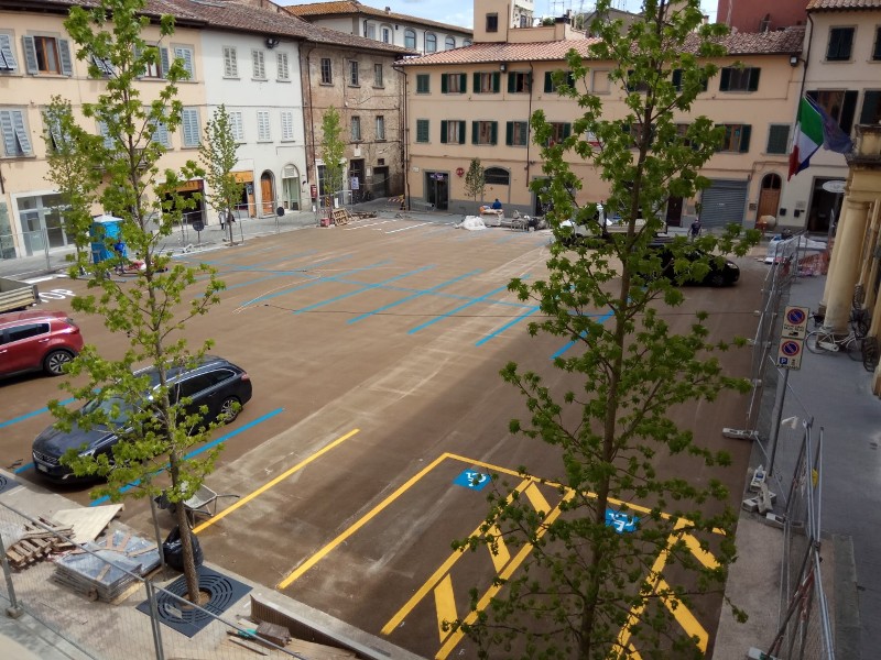 Le strade, Via dei Neri e Via Ridolfi, sono lastricate e nel frattempo prosegue la realizzazione della nuova pavimentazione in pietra ‘colombino’ della fascia a sud della piazza (lato supermercato e ristorante). Sotto le vie sono state rinnovate tutte le tubazioni e i sottoservizi, si è approfittato di questo cantiere per adeguare tutti i ‘sottoservizi’.