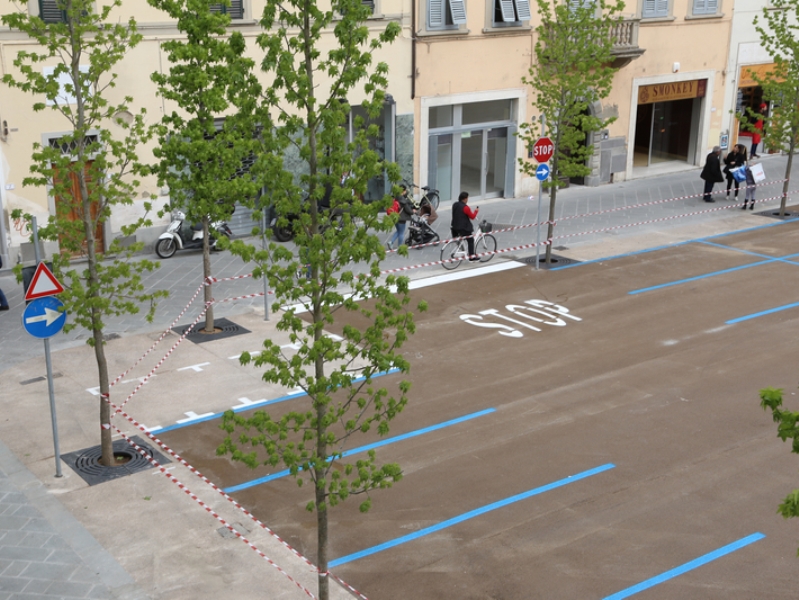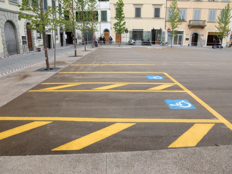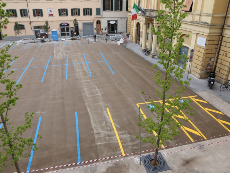 Il periodo di chiusura è servito a terminare nel più breve tempo possibile, anche grazie a condizioni climatiche non avverse, l’importante opera di rifacimento della pavimentazione di asfalto che è stata tutta scarificata. Oggi l’intera superficie della piazza si presenta nel suo perimetro con calcestruzzo architettonico, mentre al suo interno, nell’area di parcheggio con conglomerato bituminoso colorbit.