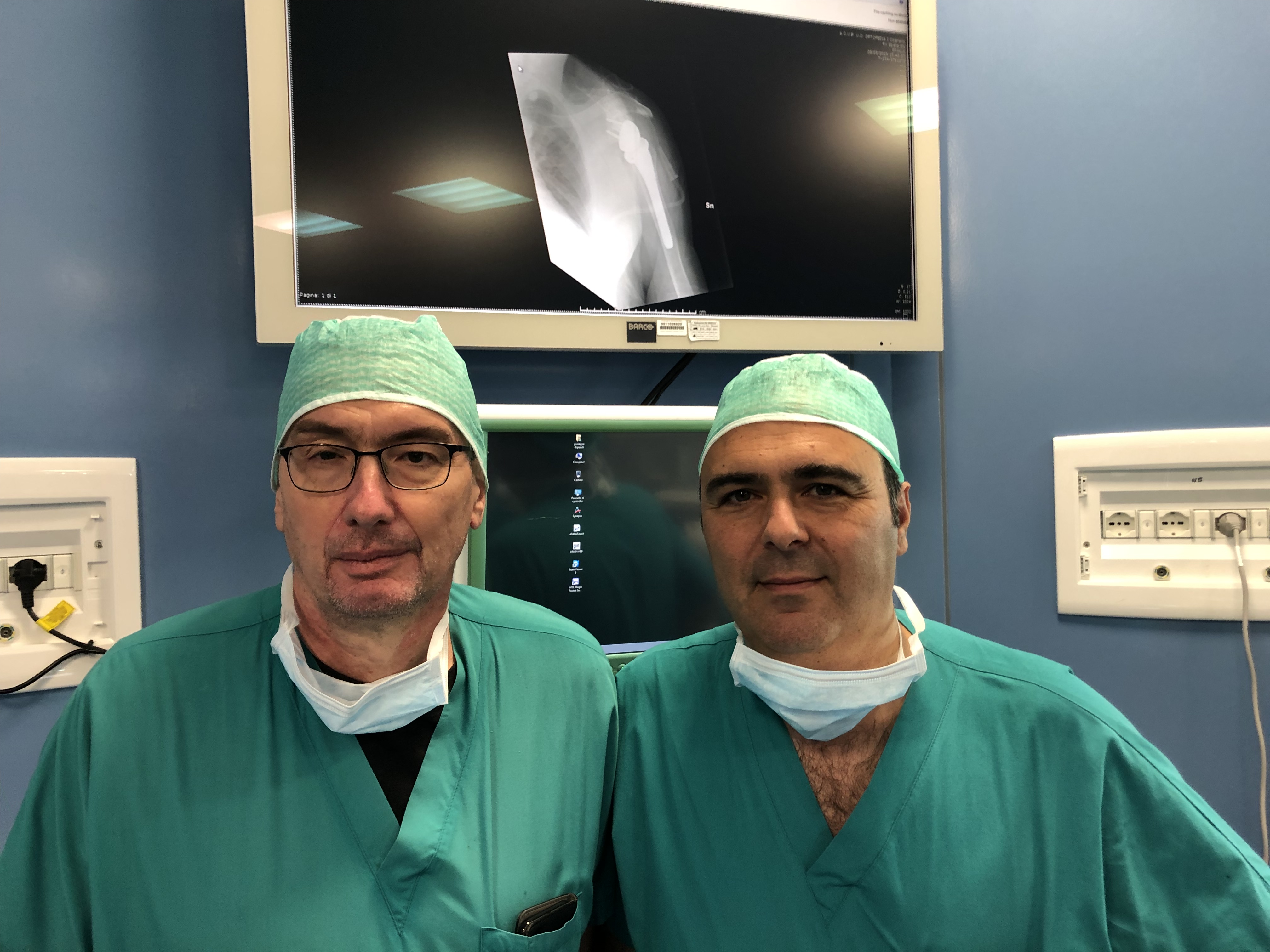 Gli ortopedici Alessandro Lippi e Giuseppe Restuccia (nella foto da sx), della Sezione dipartimentale di Ortopedia e traumatologia diretta dal dottor Maurizio Benifei, hanno portato la loro esperienza a Pisa dopo un training all’Università di Siena dove da tempo, e con successo, il professor Stefano Giannotti utilizza il sistema di navigazione proprio per l'impianto di protesi inversa di spalla.