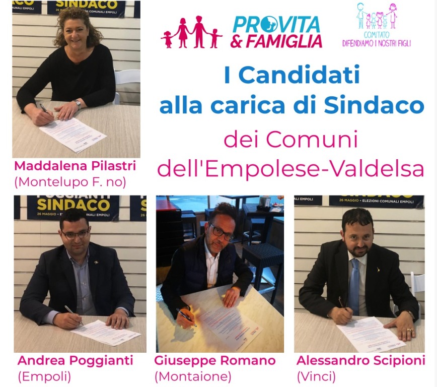Abbiamo chiesto un impegno solenne e concreto ai candidati delle prossime elezioni comunali 2019 sottoponendo alla loro attenzione il nostro Manifesto per la Vita e la Famiglia. E diversi candidati del Circondario Empolese-Valdelsa hanno promesso di rispettare alcuni punti fermi nella loro azione politica per cambiare rotta, per cambiare il vento in Italia.