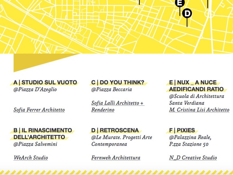 Un Battistero rivisto in chiave “pop” in piazza Salvemini, uno “studio sul vuoto” in piazza D’Azeglio, rifiuti plastici appesi in piazza Beccaria, una “Camera delle meraviglie” a Le Murate Progetti Arte Contemporanea, un quadrato in cui entrare scalzi, giocare e disegnare alla Scuola di Architettura di Santa Verdiana e uno stand mutabile dedicato al riuso alla Palazzina Reale di piazza Stazione.