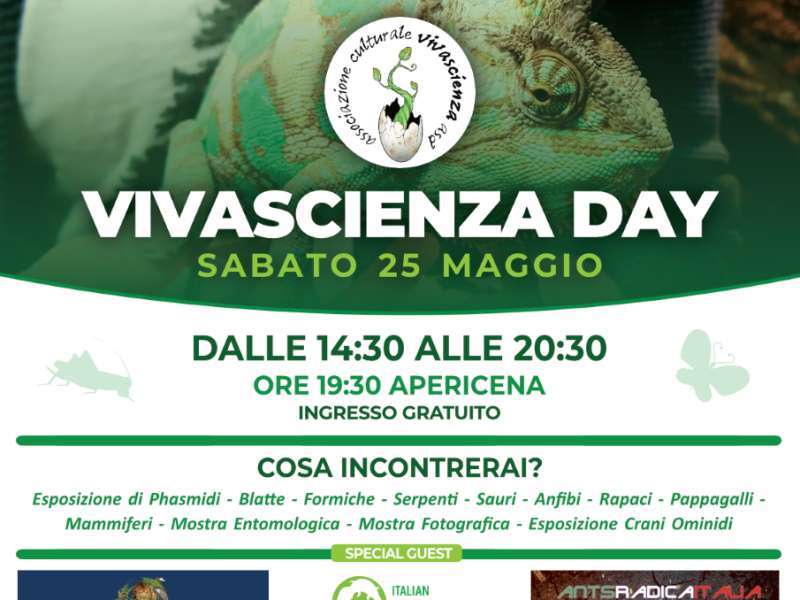 A partire dalle 14:30 di sabato 25 maggio, l’Associazione Vivascienza darà vita al Vivascienza Day, una giornata dedicata alle scienze naturali e alla scoperta degli animali.