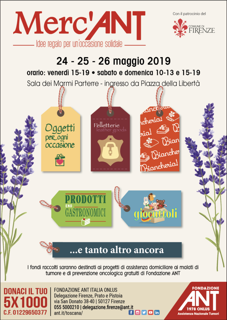 Si terrà da venerdì 24 a domenica 26 maggio ANT (con orario venerdì 15-19, sabato e domenica 10-13 e 15-19) presso la Sala dei Marmi del Parterre in Piazza della Libertà a Firenze, gentilmente concessa in uso gratuito da Quartiere 2 del Comune di Firenze, il Merc ‘ANT di Primavera che propone una serie di prodotti tipici del territorio donati da aziende locali. Tra i prodotti eno-gastronomici che si potranno trovare figurano: vini bianchi e rossi di importanti tenute toscane, l’olio extravergine Toscano iGP, la  pasta artigianale, biscotti, conserve, miele, sale speziato e molto altro. Inoltre non mancheranno i fiori di primavera e articoli di profumeria, biancheria per la casa, oggettistica, abbigliamento (primaverra-estate) e giocattoli frutto della solidarietà di aziende e privati e confezionati dai volontari ANT senza i quali non sarebbero possibili queste iniziative. La Fondazione ANT infatti è sempre alla ricerca di volontari per sostenere le proprie iniziative di raccolta fondi. La manifestazione gode del patrocinio del Comune di Firenze e la collaborazione del Quartiere 2. Tutti i fondi raccolti saranno devoluti a sostegno delle attività che ANT svolge a Firenze, Prato e Pistoia.
