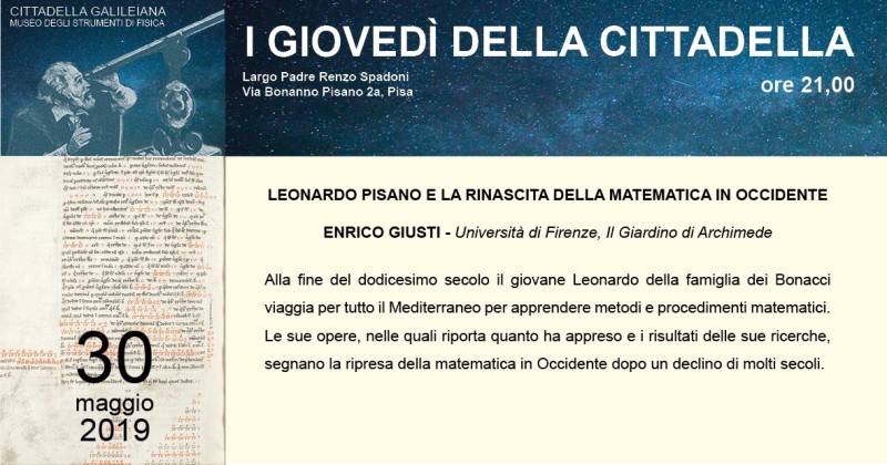 Giovedì 30 maggio, alle ore 21, appuntamento alla Cittadella Galileiana con “Leonardo Pisano e la rinascita della matematica in occidente”, incontro con Enrico Giusti, docente dell’Università di Firenze e presidente del “Giardino di Archimede”, il primo museo completamente dedicato alla matematica e alle sue applicazioni con sede a Firenze.