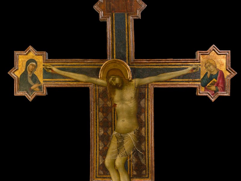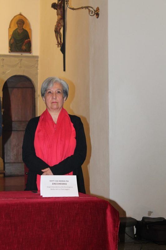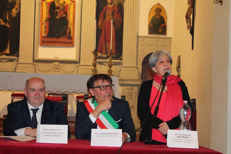 Maria Pia Zacchettu, storica dell'arte della Soprintendenza Archeologia, Belle Arti e Paesaggio per la Città Metropolitana di Firenze e le Province di Pistoia e Prato, che ha seguito le ricerche documentaristiche sulla Croce e tutta la vicenda del restauro, ne ha tracciato la storia, dopo aver portato i saluti del Soprintendente Andrea Pessina, ricordando le mostre a cui l'opera ha partecipato: 1936 Parigi, 1961 "Mostra d'arte sacra antica" - Palazzo Strozzi, Firenze. Fu Giacomo di Nicola, presentando la mostra senese su Duccio di Boninsegna del 1912, a pubblicare la Croce di San Casciano attribuendola senza ombra di dubbio a Simone Martini. "La tavola, nella sua impostazione gotica, - ha continuato Zaccheddu -mutila dell’immagine del Golgota alla base del montante a causa di un taglio effettuato nel XX secolo, esprime a pieno la volontà di una committenza che non lesinò sulla preziosità dei materiali ricchi di oro, argento, stagno, terre e minerali pregiati come l’azzurrite, accolti in linee sinuose e in sapienti sfumati che creano pienezza del corpo e morbidezza nel modellato".