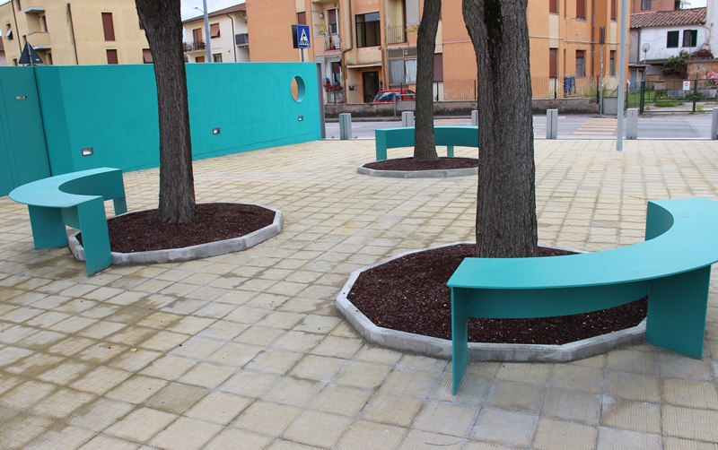 La piazzetta è stata interamente riqualificata con la nuova pavimentazione, nuove panchine di color verde a forma di un terzo di cerchio poste al di sotto dei tre alberi, ritinteggiatura dei muri che contengono la piazzetta e nuovo impianto di illuminazione. L’illuminazione dell’area pubblica è stata aumentata installando due nuovi lampioni di 4 metri di altezza e ripristinando i faretti a led esistenti sui due muri laterali. Per mantenere l’idea architettonica con cui è stata realizzata la piazzetta, è rimasta inalterata la presenza dei colori giallo per il pavimento e verde Tiffany per i muri che la contengono.