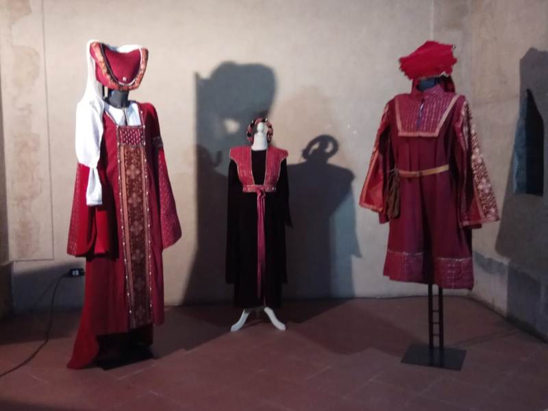 Per immergersi nell’atmosfera è stata organizzata un’anteprima grazie alla mostra degli abiti del Corteggio storico del Volo del Ciuco, dal Medioevo al Rinascimento, allestita nella splendida chiesa di Santo Stefano degli Agostiniani, visitabile da fino a domenica 16 giugno 2019. Una selezione davvero accurata, particolare e significativa, espressione del fatto a mano delle sarte della Compagnia di Sant’Andrea. Abiti ma anche accessori dell’epoca.