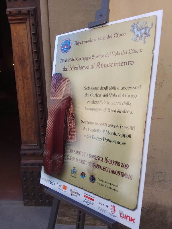 Per immergersi nell’atmosfera è stata organizzata un’anteprima grazie alla mostra degli abiti del Corteggio storico del Volo del Ciuco, dal Medioevo al Rinascimento, allestita nella splendida chiesa di Santo Stefano degli Agostiniani, visitabile da fino a domenica 16 giugno 2019. Una selezione davvero accurata, particolare e significativa, espressione del fatto a mano delle sarte della Compagnia di Sant’Andrea. Abiti ma anche accessori dell’epoca.