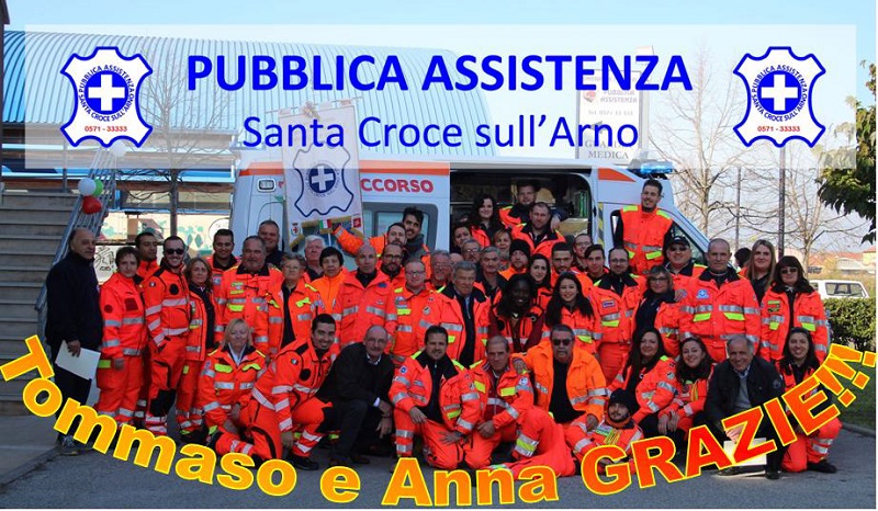 L’Associazione PUBBLICA ASSISTENZA di SANTA CROCE SULL’ARNO esprime il suo sentito ringraziamento ai signori Tommaso e Anna per la generosa donazione da loro ricevuta. Il 28 maggio, in occasione del sessantesimo compleanno della moglie Anna, il sig.Tommaso Roviezzo ha organizzato una raccolta fondi a sorpresa, il cui ricavato è stato donato alla nostra Associazione. La Pubblica Assistenza destinerà la somma ricevuta ad attività in favore della comunità e del bene comune. Buon compleanno Anna! E ’bellissimo sapere che ci sentite vicini, grazie di cuore da parte di tutta la Pubblica Assistenza