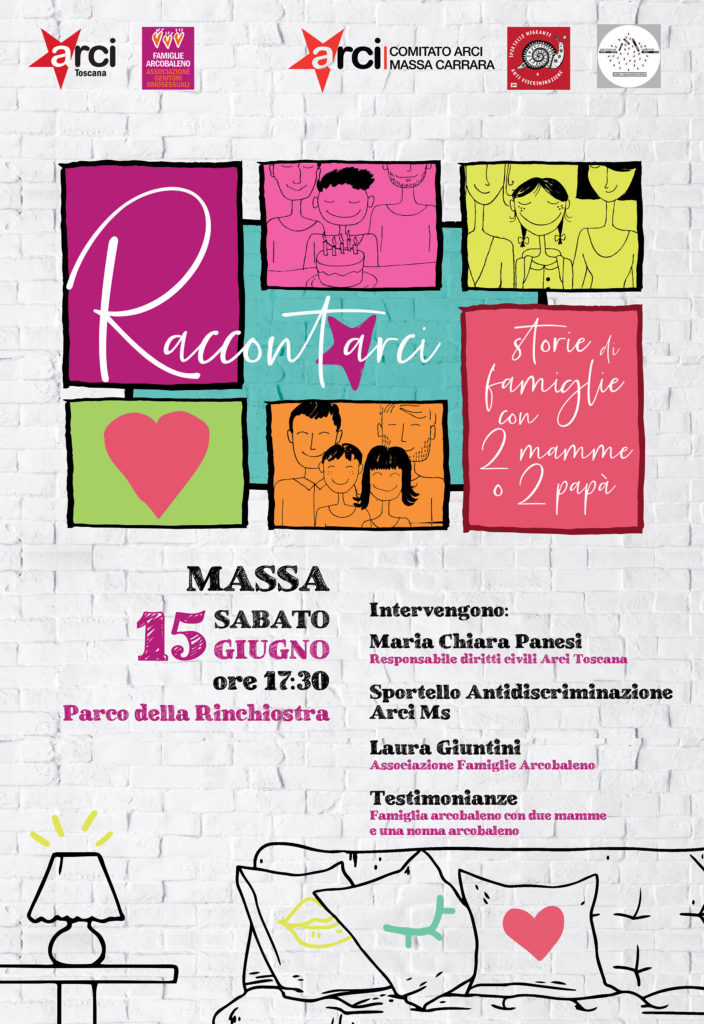 Arci Toscana e Famiglie Arcobaleno insieme per affrontare, su scala regionale, il tema della genitorialità omosessuale, dei diritti civili e delle famiglie che cambiano, attraverso una serie di eventi: "Raccontarci, storie di famiglie con due mamme o due papà", un’iniziativa nata dalla volontà di stimolare una riflessione da parte delle cittadine e dei cittadini della nostra regione sul tema dell'omogenitorialità. Ogni evento si compone di due parti: una dedicata a fotografare – da un punto di vista sociale e normativo – la situazione attuale e l’altra costruita su testimonianze dirette di famiglie dell'Associazione, con anche nonne o nonni arcobaleno, nella convinzione che il confronto diretto e l'ascolto delle testimonianze personali siano il miglior antidoto contro disinformazione e pregiudizi.