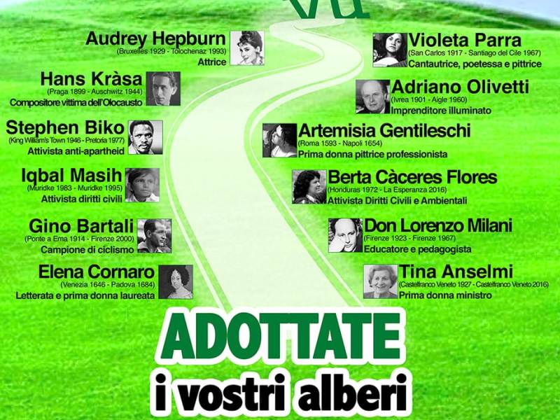 Adozione di 12 alberi e inaugurazione della seconda parte del Viale dell'Umanità e dei Diritti Umani venerdì 7 giugno 2019, alle 11, presso la scuola media Enrico Fermi di via Leoncavallo a Scandicci; gli alberi saranno intitolati ad Audrey Hepburn, attrice (Bruxelles 1929-Tolochenaz 1993), Hans Krasa, compositore vittima dell'Olocausto (Praga 1899-Auschwitz 1944), Stephen Biko, attivista anti apartheid (king William's Town 1946-Pretoria 1977), Iqbal Masih, attivista dei diritti civili (Muridke 1983-Muridke 1995), Gino Bartali, campione di ciclismo (Ponte a Ema 1914-Firenze 2000), Elena Cornaro, letterata (Venezia 1646-Padova 1684), Violeta Parra, cantautrice, poetessa e pittrice (San Carlos 1917-Santiago del Cile 1967), Adriano Olivetti, imprenditore (Ivrea 1901-Aigle 1960), Artemisia Gentileschi, pittrice (Roma 1593-Napoli 1654), Berta Caceras Flores, attivista diritti civili e ambientali (Honduras 1972-La Esperanza 2016), Don Lorenzo Milani,sacerdote, educatore e pedagogista (Firenze 1923-Firenze 1967) e Tina Anselmi, partigiana e prima donna Ministro della Repubblica Italiana (Castelfranco Veneto 1927-Castelfranco Veneto 2016). L'inaugurazione è a cura del Comitato Viale dell'Umanità e dei Diritti Umani con il patrocinio del Comune di Scandicci.