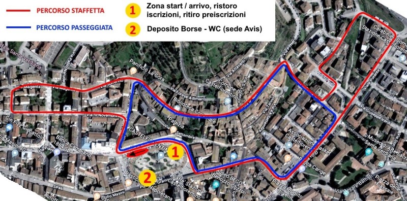 La manifestazione, che gode del patrocinio del Comune, prevede due possibilità, al fine di favorire la più ampia partecipazione: la 1° staffetta competitiva (partenza 20.30, km 2,3x3) e la camminata (partenza 21.15, km 1,2). Il ritrovo è in Piazza Gramsci alle ore 19.00 (area pedonale di fronte al Teatro del Popolo) dove sarà allestito un punto ristoro, la postazione per raccogliere le iscrizioni e il traguardo. La manifestazione si svolgerà lungo un percorso cittadino, interessando il centro storico basso e alto, senza interferire in modo pesante con la circolazione stradale; a tal fine, sono previsti venti “punti di sorveglianza” lungo il tracciato, in modo da garantire la sicurezza dei partecipanti.