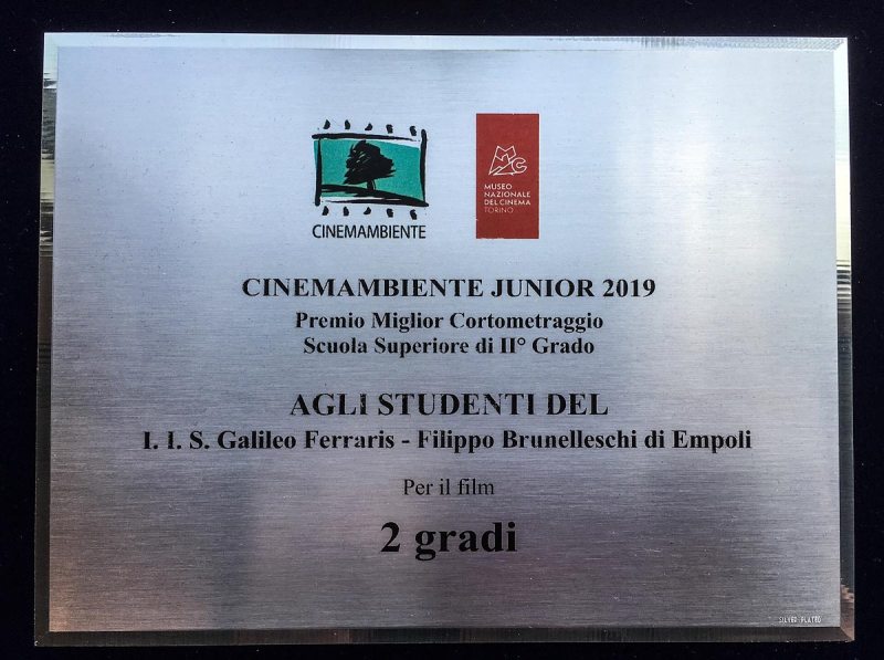 Mercoledì 5 giugno – alla presenza del Ministro dell’Ambiente e della Tutela del Territorio e del Mare, del sindaco di Torino, della giuria, di tanti esperti del settore cinema e di un gremito pubblico – gli alunni dell’I.I.S. “Ferraris-Brunelleschi” di Empoli (FI) hanno conquistato il premio per il miglior cortometraggio delle Scuole Secondarie di II grado con “2 Gradi”.