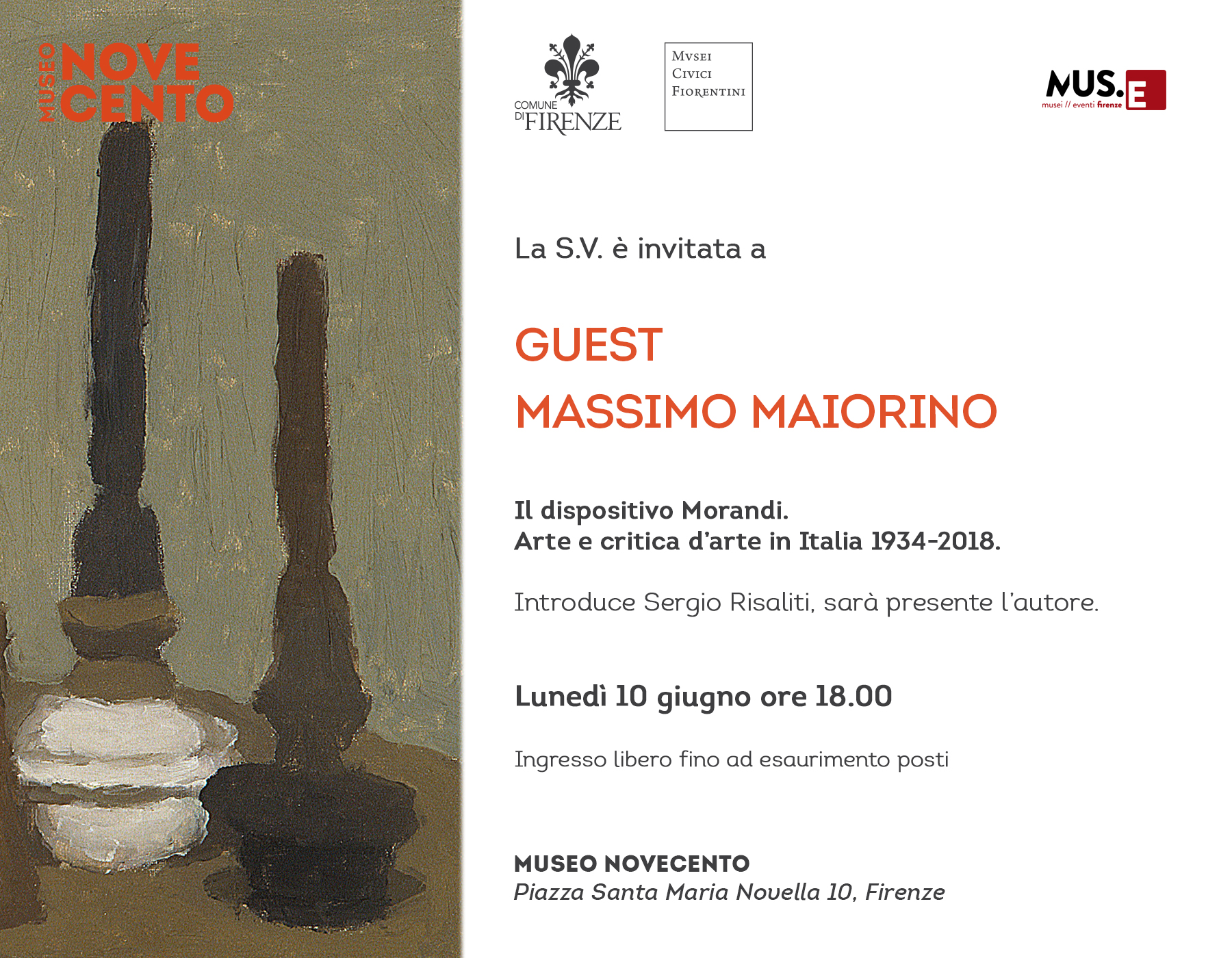 Torna con un nuovo appuntamento il ciclo Guest, che lunedì 10 giugno alle 18 vede lo storico dell’arte Massimo Maiorino presentare il suo libro Il dispositivo Morandi. Arte e critica d’arte in Italia 1934-2018(Quodlibet, 2019) insieme al direttore artistico del museo, Sergio Risaliti. La presentazione fa parte del calendario di eventi che hanno fatto da corollario alla monografica “Exit. Morandi” in corso al primo piano del museo, curata da Maria Cristina Bandera e Sergio Risaliti. La figura di Giorgio Morandi, la sua presenza/assenza nelle trame dell’arte e della critica italiana del Novecento, è il centro del recente volume di Maiorino. Una linea di ricerca che ricostruisce ed evidenzia, attraverso la lente teorica del “dispositivo” mutuata da Deleuze, le voci e le differenti prospettive, i racconti e le genealogie che l’opera di Morandi ha sollecitato. Ad emergere dall’esame dell’eterogeneità di letture ed ipotesi - espresse attraverso una pluralità di linguaggi che oscillano tra parola ed immagine restituendo l’ampiezza del sistema dell’arte - è la proteiforme vitalità dell’opera morandiana e l’inesauribile attualità dell’artista italiano e della sua opera.