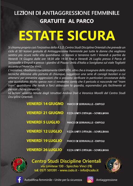 Si chiamo proprio così l'iniziativa della A.S.D. Centro Studi Discipline Orientali che prevede un ciclo di sei lezioni gratuite di Antiaggressione Femminile per tutte le donne che vogliono sentirsi più sicure nella vita quotidiana.