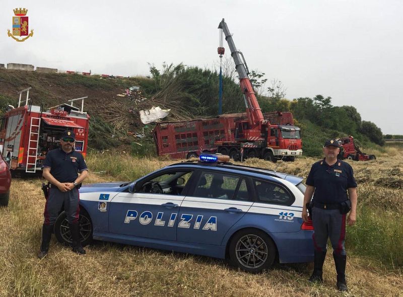 La Polizia Stradale di Grosseto è intervenuta all’alba di stamane presso lo svincolo di Giuncarico sull’Aurelia, a Gavorrano (GR), dove un mezzo pesante a due piani che stava trasportando 56 vitelli è finito fuoristrada, ribaltandosi.