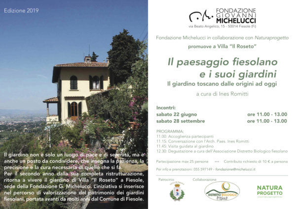 La Fondazione Giovanni Michelucci in collaborazione con Naturaprogetto, Associazione Distretto Biologico Fiesolano e con il patrocinio del Comune di Fiesole, promuove per la giornata di sabato 22 giugno 2019 alle ore 11.00 il primo incontro di "Il paesaggio fiesolano e i suoi giardini. Il giardino toscano dalle origini ad oggi", un'occasione per scoprire il giardino di Villa "Il Roseto" a Fiesole e degustare i prodotti locali dell'Associazione Distretto Biologico Fiesolano.
