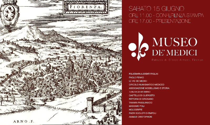 Il prossimo 15 giugno 2019 alle ore 17:00 sarà presentato a Firenze, nella prestigiosa sede del Palazzo di Sforza Almeni in via dei Servi 12, il Museo de'Medici. All’evento interverranno il Presidente del Consiglio Regionale della Toscana Eugenio Giani e il Prof. Giovanni Cipriani, storico e docente dell’Università degli Studi di Firenze.