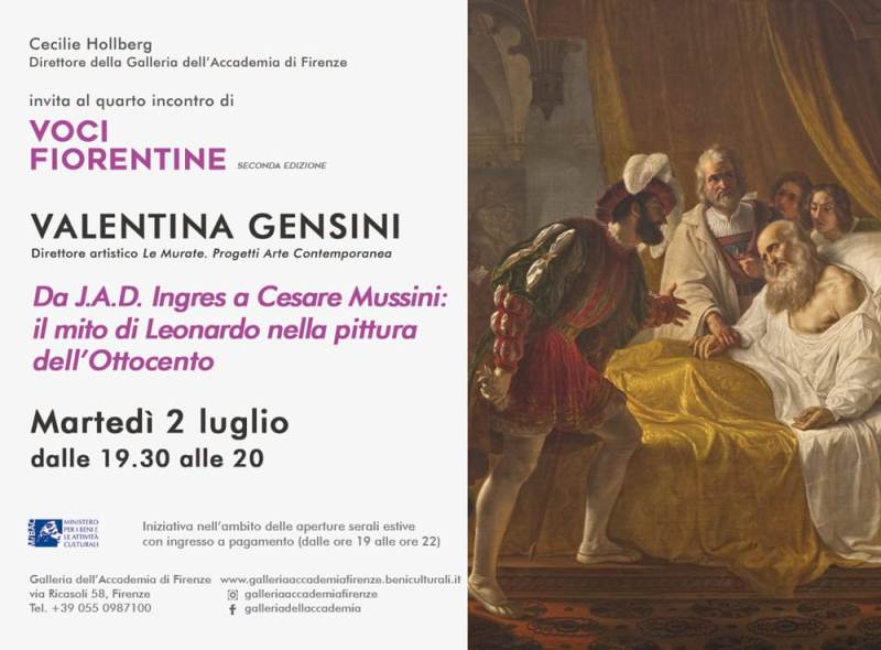 La settimana successiva, il 18 giugno, Arturo Galansino, Direttore Generale di Palazzo Strozzi, propone il tema dell’Incoronazione della Vergine, iconografia ben rappresentata nelle raccolte di fondi oro della Galleria, con focus sulle tavole di Iacopo di Cione, Niccolò di Tommaso e Simone di Lapo. Il Direttore del Corriere fiorentino, Paolo Ermini, ci porterà il 25 giugno alla scoperta del Cassone Adimari dello Scheggia. A seguire, il 2 luglio, Valentina Gensini, Direttore artistico de Le Murate Progetti d’arte contemporanea, parlerà, prendendo spunto dal dipinto di Cesare Mussini in Gipsoteca, del mito di Leonardo da Vinci nella pittura dell’Ottocento, mentre il 9 luglio Enrico Colle, Direttore del Museo Stibbert, guiderà alla conoscenza di una particolare tipologia di arte applicata: la cornice, fra Gotico, Neogotico e Rococò. Si proseguirà con Irene Sanesi, Presidente dell’Opera di Santa Croce, che il 16 luglio dedicherà la sua conversazione alla Zenobia di Michele Tosini, detto il Ghirlandaio. Dopo una pausa nel mese di agosto, le conversazioni riprenderanno il 3 settembre con Laura Lombardi, storica dell’arte e docente all’Accademia di Belle Arti di Brera, con un excursus, in Gipsoteca, sui gessi di Lorenzo Bartolini maestro del ‘bello naturale’. Luca Bagnoli, Presidente dell’Opera di Santa Maria del Fiore, si dedicherà, il 10 settembre, al racconto, dal punto di vista economico, “Diventare David: da blocco di marmo a simbolo civico”.Patrizia Asproni, Presidente del Museo Marino Marini di Firenze, offrirà un approfondimento sul Medaglione per il monumento di Gerolamo Segato. La rassegna chiuderà, il 24 settembre, con Carlo Sisi, Presidente dell’Accademia di Belle Arti di Firenze, che converserà sulla Musica Sacra di Luigi Mussini, raffinato dipinto manifesto del Purismo in Toscana, esposto in Giposteca.