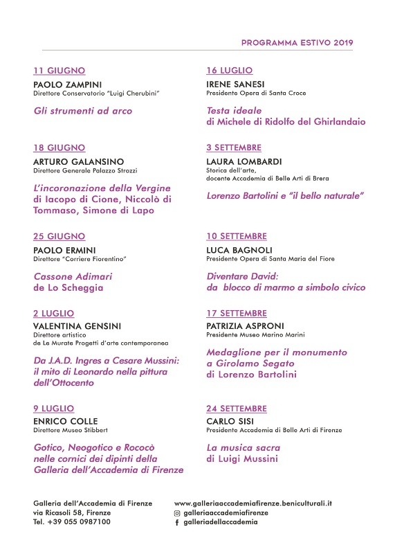 Gli appuntamenti intendono offrire al pubblico approfondimenti sulle opere nelle collezioni permanenti del museo, spaziando dalle tavole trecentesche, ai capolavori dipinti del XV e XVI secolo, agli strumenti musicali e alla raccolte ottocentesche della Gipsoteca: brevi ma coinvolgenti conversazioni, a cura di note personalità del mondo culturale fiorentino, per offrire al pubblico focus tematici su capolavori celeberrimi come su opere meno note presenti nelle varie raccolte della Galleria dell’Accademia di Firenze.