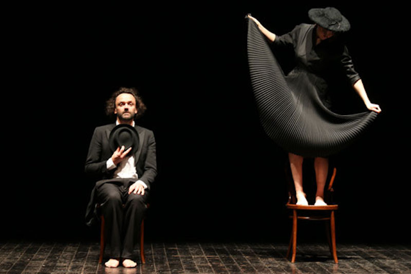 La storia di un uomo e una donna. Due sedie e un microfono. Una chitarra. Un teatro fisico, a tratti comico e grottesco, poetico e assurdo, dove la parola diventa gramelot, dove la musica e il suono in scena dialogano con il movimento. Due personaggi eleganti che si rincorrono, aspettano, danzano a piedi scalzi sopra una terra secca. Si intrecciano le voci di un rito funebre, il ritmo rebetiko di una festa, gli allegri saluti di chi parte e di chi arriva.