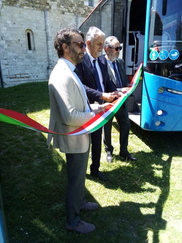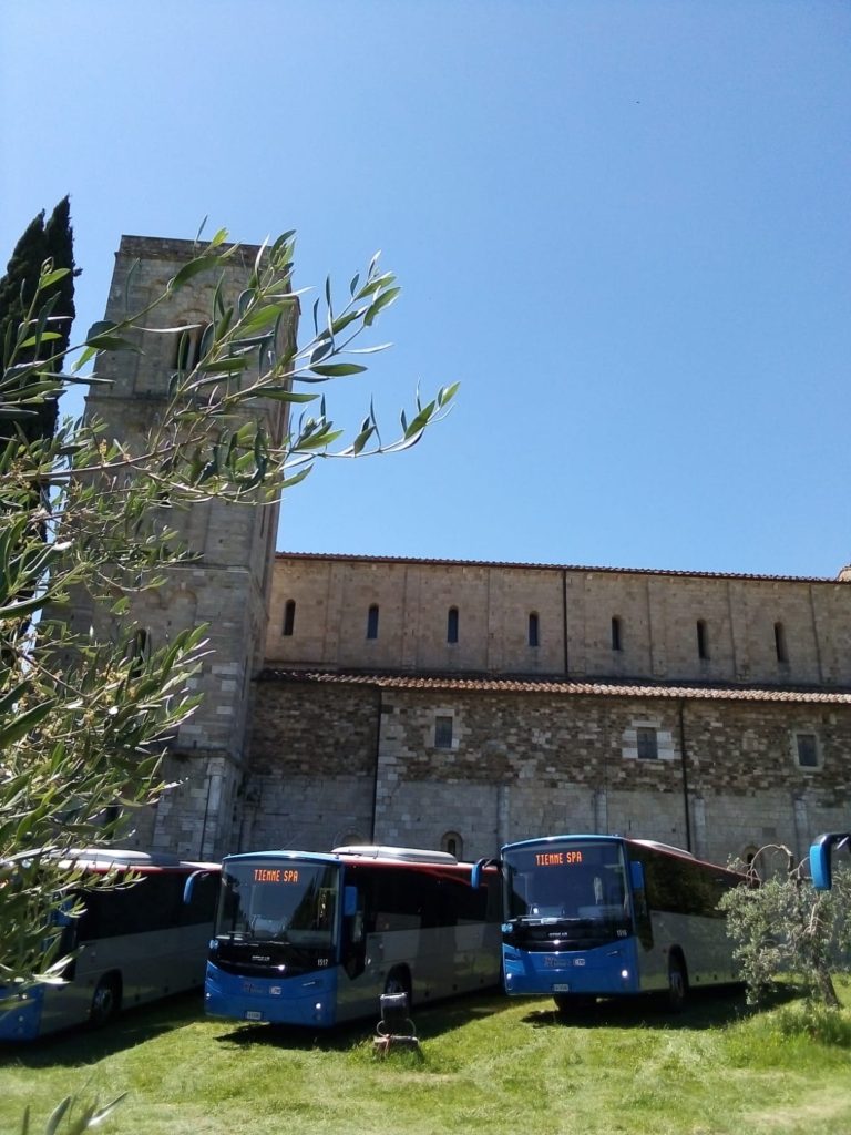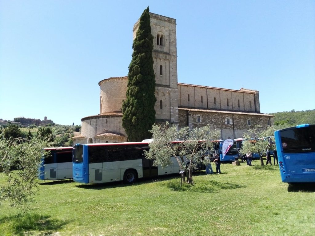 Nuova tappa del percorso di rinnovamento della flotta autobus di Tiemme. Questa volta la suggestiva cornice scelta nel cuore della Toscana è stata quella dell’Abbazia di S. Antimo, nel comune di Montalcino, quasi a metà tra le province di Siena e Grosseto.