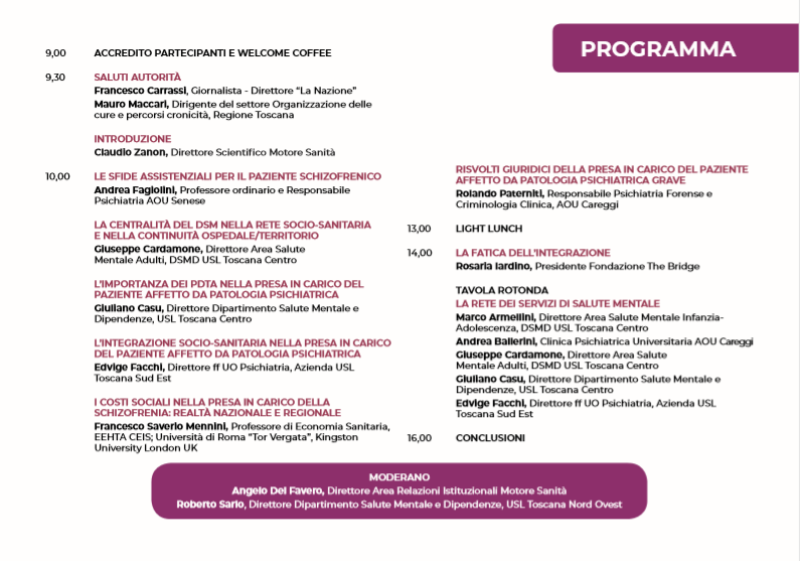 Per riuscire a gestire questi numeri è importante che i dipartimenti psichiatrici, caso emblematico la gestione acuta ecronica del paziente schizofrenico, lavorino coordinati all’interno di una rete che dia risposte efficaci, dalla gestione della crisi, alla riabilitazione del paziente stesso, aiutando il gravoso compito delle famiglie e supportando anche economicamente i vari attori del sistema. Per riportare questo sistema, fin troppo spesso dimenticato, al centro dell'attenzione dei cittadini e della politica Motore Sanità, con il patrocinio di Regione Toscana e della Conferenza delle Regioni e delle Province autonome e con il contributo incondizionato di Angelini, ha organizzato l'evento “LA PRESA IN CARICO INTEGRATA DEL PAZIENTE PSICHIATRICO NEL DIPARTIMENTO DI SALUTE MENTALE NEI DSM DELLA TOSCANA” che il 13 giugno a Firenze presso l'auditorium del quotidiano La Nazione ha riunito esponenti del mondo sanitario e di quello politico per fare il punto sulla situazione attuale in Toscana e per delineare con chiarezza il futuro che si prospetta per questa branca della medicina. Il convegno ha voluto evidenziare i punti di forza e le criticità dei servizi psichiatrici del territorio con particolare attenzione alla schizofrenia, malattia simbolo sociale della clinica psichiatrica.