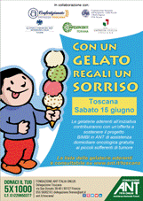 “Con un Gelato regali un sorriso” è la manifestazione organizzata da Fondazione ANT Italia Onlus che anche quest’anno coinvolgerà i gelatieri di Firenze e delle altre province toscane. Sabato 15 giugno in tutta la regione si terrà infatti una vera e propria giornata del gelato, durante la quale oltre 100 gelaterie devolveranno una percentuale dell’incasso a favore del progetto “Bimbi in ANT”, il servizio di assistenza socio-sanitaria domiciliare gratuita che la Fondazione offre ai piccoli malati di tumore. L’iniziativa, giunta alla tredicesima edizione, è resa possibile grazie alla collaborazione di Confcommercio, Confartigianato, CNA e Confesercenti  Toscane. Nelle gelaterie aderenti, facilmente riconoscibili dalla locandina o consultabili sul sito www.ant.it/toscana, oltre a gustare un ottimo gelato si potrà dunque compiere un gesto di grande valore aiutando la Fondazione ANT. Come sottolineato dalla Dott.ssa Alessandra Pellegrini, medico responsabile dell’équipe sanitaria ANT della Toscana: “Nel 2018 la giornata del gelato ha portato alla Fondazione oltre 6.000 euro pari ad 200 giornate di assistenza domiciliare gratuita e siamo fiduciosi di poter raccogliere anche quest’anno i fondi necessari per continuare e ampliare il nostro intervento sul territorio. La sinergia fra i gelatieri e le associazioni di categoria ci permette di far conoscere sempre di più il grande lavoro che gli operatori sanitari ANT svolgono ogni giorno, non solo per gli adulti ma anche per i pazienti più piccoli”.