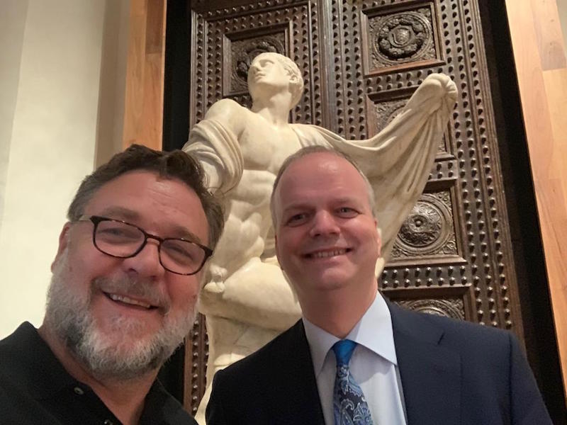 Il 'Gladiatore' Russell Crowe in visita agli Uffizi. L'attore neozelandese, premio Oscar nel 2001 come attore protagonista del celeberrimo film di Ridley Scott, oggi ha deciso di trascorrere in compagnia di alcuni amici una mattinata in Galleria. L'interprete di Massimo Decimo Meridio, accompagnato dal direttore del museo Eike Schmidt, ha così potuto ammirare gli antichi tesori romani della speciale esposizione archeologica 'Tutti gli uomini dell'imperatore': in particolare, ha apprezzato la scultura dell'Arianna dormiente, l'urna cineraria del liberto Elio Proculo (recentemente acquistata dagli Uffizi) e il marmo Niobide in fuga, sotto il quale si è scattato un selfie insieme a Schmidt. Quindi la visita è proseguita nelle nuove sale del Cinquecento, dove Crowe si è lasciato incantare dalla Venere di Urbino di Tiziano, dall'Eleonora di Toledo di Bronzino, dalla Caduta degli Angeli ribelli di Andrea Commodi e da molti altri dipinti, scattando foto alle opere e postandone alcune sui propri social. L'attore non si è negato ai molti visitatori che, riconoscendolo, gli hanno chiesto foto e autografi, ed alla fine del tour, durato circa tre ore, si è concesso anche un caffè sulla terrazza del museo affacciata su Piazza Signoria.