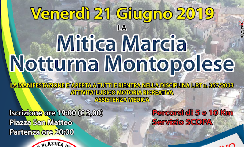 L'Associazione Culturale Arco di Castruccio, in collaborazione con il Gruppo Podistico Casa Culturale di San Miniato Basso, in continuità con il programma del 2018, è lieta di riproporre la "Mitica Marcia Montopolese Notturna", "Plastic-Free", manifestazione podistica non competitiva, ludico motoria, di 5 e 10 Km,  che si svolgerà Venerdì 21 Giugno p.v. con inizio alle ore 19:30, partenza ed arrivo in Piazza San Matteo a Montopoli v/a.