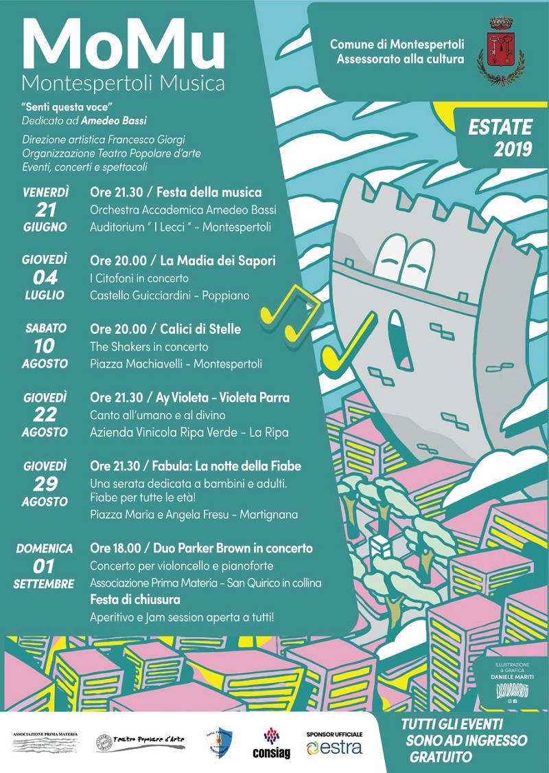 Anche questa estate, il Comune di Montespertoli offre un ricco calendario di eventi musicali e d'intrattenimento. Dopo la 62esima Mostra del Chianti e l'avvio dell'edizione 2019 delle Veglie sulle Aie, stasera inizia la nuova edizione di Montespertoli Musica Estate che si protrarrà poi fino a domenica 1 Settembre. Le serate di MoMu porteranno la musica nei castelli e nei luoghi d'arte più suggestivi, immersi nella splendida campagna di Montesper-toli. L'edizione 2019 sarà a cura del Teatro Popolare d’Arte e la direzione artistica sarà affi-data a Francesco Giorgi. L'edizione di quest'anno sarà dedicata al tenore di Montespertoli Amedeo Bassi nella ricorrenza dei settanta anni dalla morte.