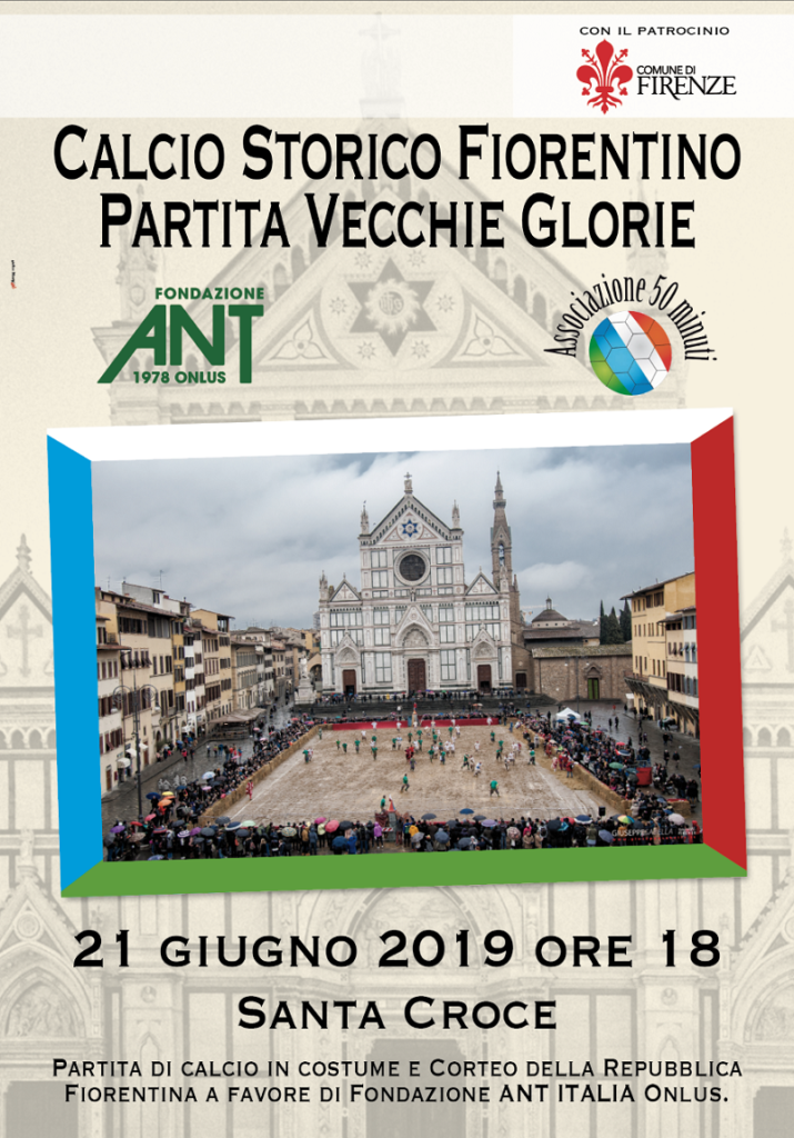 Venerdì 21 giugno alle ore 18.00 – nell’ambito delle manifestazioni legate al calcio storico fiorentino – si svolgerà in Piazza Santa Croce la Partita delle Vecchie Glorie del Calcio Storico. Le offerte raccolte saranno devolute a Fondazione ANT Italia Onlus – per sostenere le attività gratuite di assistenza specialistica domiciliare ai malati di tumore e di prevenzione oncologica. Le Vecchie Glorie del Calcio Storico Fiorentino sono i calcianti che hanno giocato almeno cinque volte in partite ufficiali del torneo di giugno organizzato dall’Ufficio delle Tradizioni Storiche del Comune di Firenze. Hanno fatto la storia degli ultimi quarant’anni di Calcio in Costume, lottando sul sabbione di Santa Croce per far vincere la propria squadra, il proprio Quartiere, combattendo contro gli stessi avversari che attualmente sono nella squadra delle Vecchie Glorie. La struttura sanitaria della Fondazione ANT nella regione Toscana è composta da 9 medici, 7 infermieri e 4 psicologi. Per informazioni è possibile contattare il numero 055 5000210 oppure consultare il sito www.ant.it/toscana nella sezione iniziative in corso.