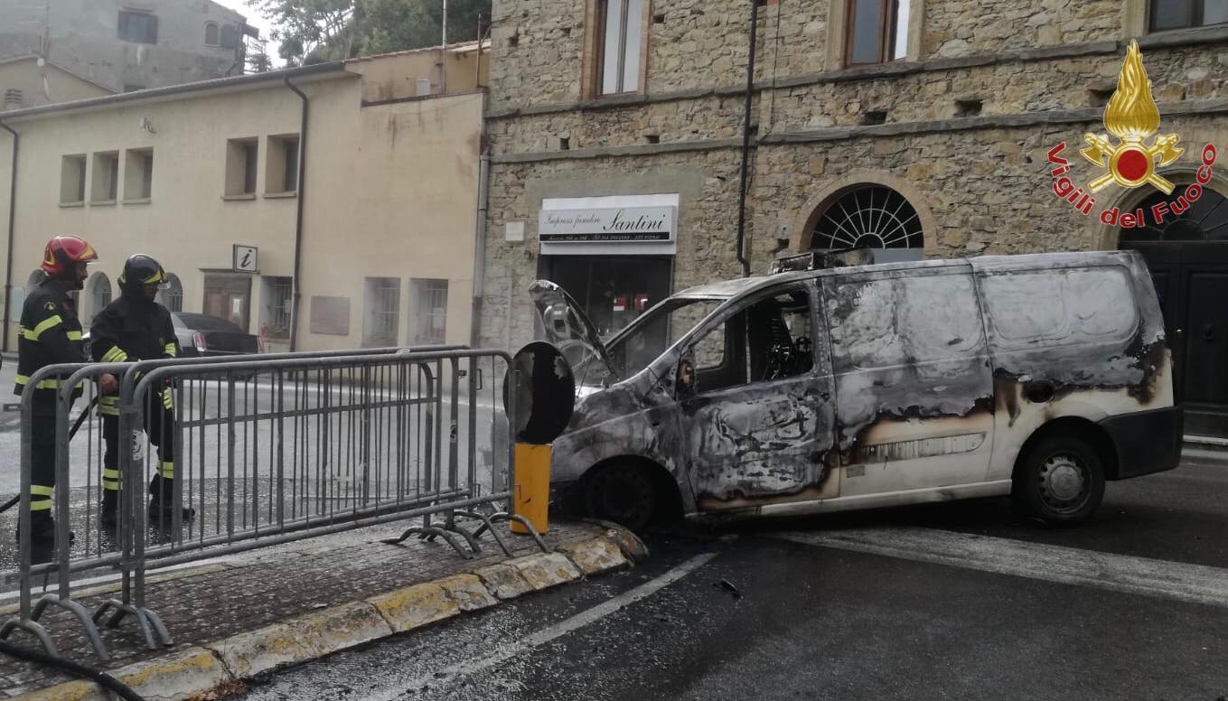 Alle 6.30 di oggi un furgone che trasportava medicinali è andato a fuoco nel comune di Montecatini Val di Cecina in piazza Matteotti.
