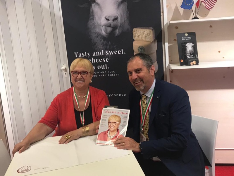 Nello stand del Consorzio tutela Pecorino Toscano DOP, il direttore Andrea Righini ha accolto Lidia Bastianich, madre dello chef Joe Bastianich, ma anche chef a sua volta, scrittrice, personaggio televisivo molto noto negli Stati Uniti, fra i giudici dell’edizione italiana di Masterchef Junior, reality per piccoli aspiranti cuochi e premiata più volte per i suoi programmi di cucina.