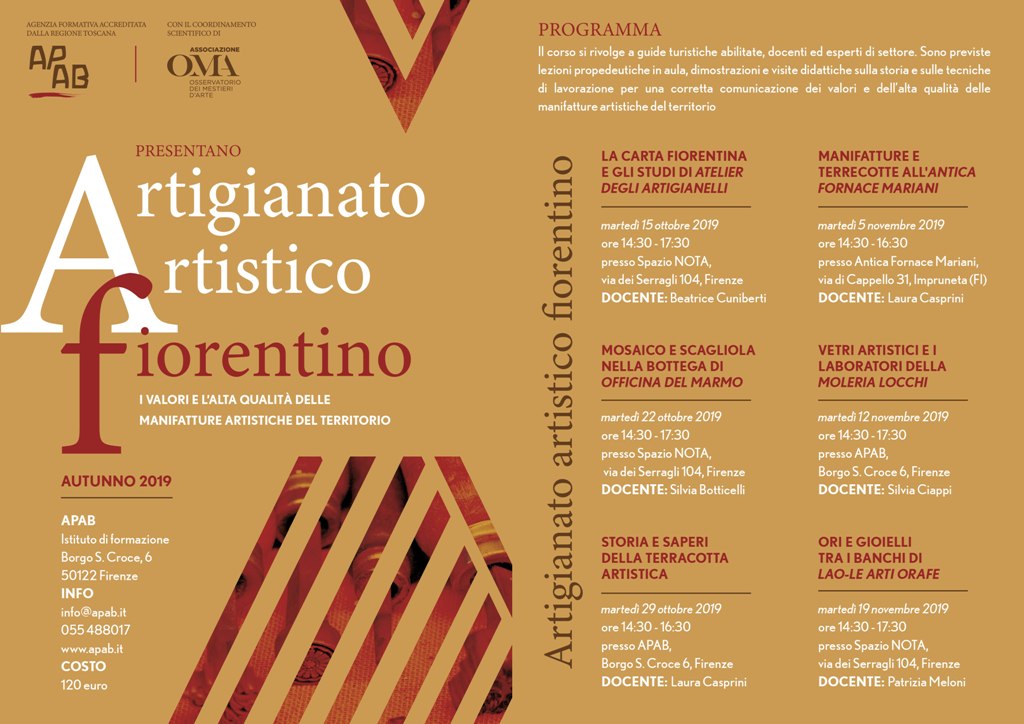 Al via da oggi le iscrizioni per il corso ‘Artigianato Artistico Fiorentino – I valori e l’alta qualità delle manifatture artistiche del territorio’. L’iniziativa, voluta dall'Agenzia Formativa accreditata dalla Regione Toscana APAB, è organizzata e promossa dall'Associazione OMA - Osservatorio dei Mestieri d’Arte e mira a fornire conoscenze approfondite sulle tecniche dell’artigianato artistico fiorentino. Composto da sei incontri (16 ore complessive) aperti a tutti, in particolare alle guide turistiche abilitate, a docenti ed esperti di settore, il corso si svolgerà in autunno (15-22-29 ottobre, 5-12-19 novembre) e tratterà le principali tecniche: mosaico, scagliola, terracotta, carta fiorentina, vetri e arti orafe. Sono previste lezioni in aula sulla storia e sulle tecniche, allo Spazio NOTA e nella sede di APAB, ma anche visite nei laboratori con dimostrazioni pratiche.