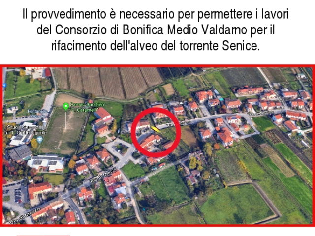 Da lunedì 1 luglio fino a sabato 31 agosto via di Mezzo sarà interrotta all'altezza dell'attraversamento sul torrente Senice, poche decine di metri a valle della scuola di Vignole (direzione Caserana). Si tratta di pochi metri di interruzione, tra i numeri civici 149 e 151, necessari per permettere al Consorzio di Bonifica Medio Valdarno di risagomare completamente l’alveo della Senice: in quel punto. Infatti, sarà tolto l’attuale scatolare che convoglia l’acqua del torrente e sul quale passa la strada e verrà sostituito con una struttura più grande, in modo da evitare una strozzatura del corso d’acqua. Si tratta di un intervento piuttosto complesso, anche perché sarà necessaria la ricollocazione dei sottoservizi, compreso il gasdotto, che in quel punto corrono sotto la strada.