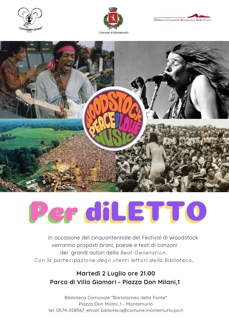 Il Comune di Montemurlo a 50 anni dal Festival di Woodstock martedì 2 luglio ore 21 nel parco di Villa Giamari (piazza Don Milani, 1- Montemurlo) propone uno spettacolo di letture di poesie e brani di canzoni dal titolo “Per diLetto, omaggio alla beat generation”. La serata, con la regia di Mirko Gianformaggio dell'asd I Formaggini Guasti, vuol essere un omaggio alle poetesse e ai cantanti della beat generation, quella corrente di pensiero che ha segnato un 'epoca e che ancora, a distanza di mezzo secolo, vive sotto altre forme e affascina persone di ogni età. Lo spettacolo nasce da un laboratorio dal titolo“Per diLetto”, che si è svolto alla biblioteca Della Fonte alcune settimane fa e che ha coinvolto lettori volontari, guidati con passione in questo percorso di lettura-teatrale da Mirko Gianformaggio e Patrizia Guastini Gli interpreti sono Alessandra Bartali, Roberta Chiti, Alessandra Forlani, Deanna Lastrucci Tozzi, Fabrizio Panetta, Nicoletta Santoni, Marco Torracchi e Lucia Trombacco e offriranno agli spettatori un'intrigante alternanza fatta di incursioni nell'intimo delle scrittrici, in un ritmato passaggio dalla sfera personale al sociale, dove le vicende personali e sentimentali si incrociano con le istanze collettive. Un'occasione per conoscere o riscoprire alcune tra le maggiori poetesse della beat generation come Diane Di Prima, Leonore Handel, Barbara Guest, Karen Blessed, Janine Pommy Uega, Hettie Jones, Elise Cowen, Denise Levertov e Joanna Mclure.