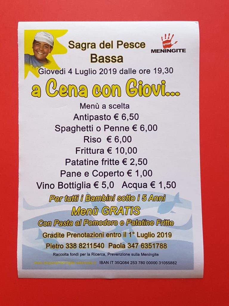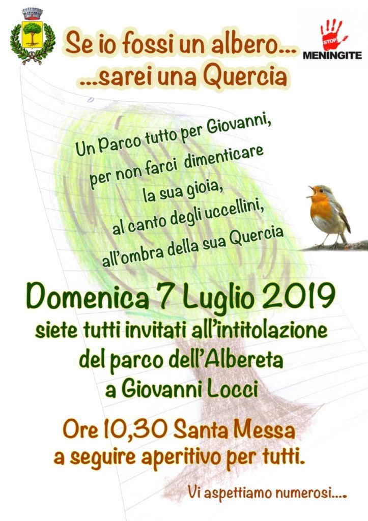 Una di queste iniziative ‘A cena con Giovi’ si terrà giovedì 4 luglio dalle ore 19:30 alla sagra del pesce a Bassa. Il ricavato della cena sarà destinato all’acquisto di un attrezzo sportivo da esterno che verrà installato nel nuovo parco dell’Albereta di Bassa che sarà proprio intitolato a Giovanni Locci. L’inaugurazione del parco si terrà domenica 7 luglio. Alle ore 10:30 ci sarà la Santa messa e al termine della cerimonia l’associazione Stop alla Meningite offrirà un aperitivo a tutti i partecipanti.