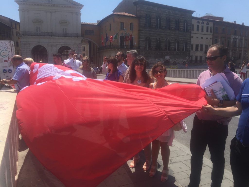 A un anno dalle elezioni amministrative storicamente vinte dalla Lega, i consiglieri comunali insieme al sindaco Michele Conti, all'onorevole Edoardo Ziello, al commissario regionale e neo-deputata europea Susanna Ceccardi e agli altri militanti, hanno donato alla città la bandiera della croce pallata.