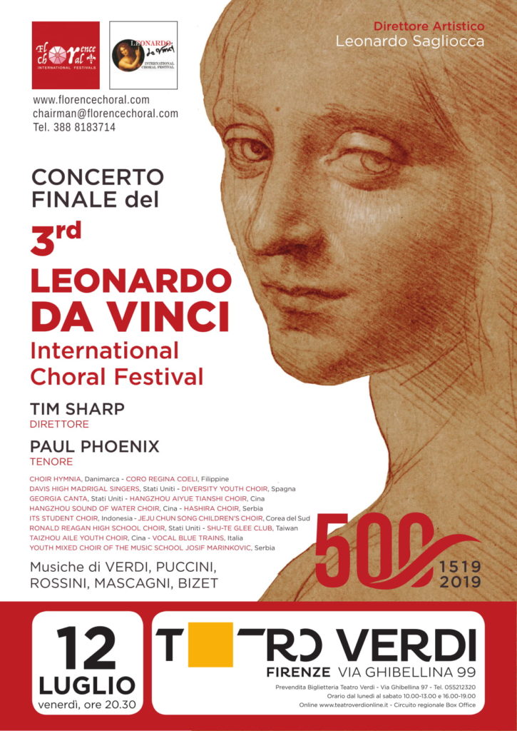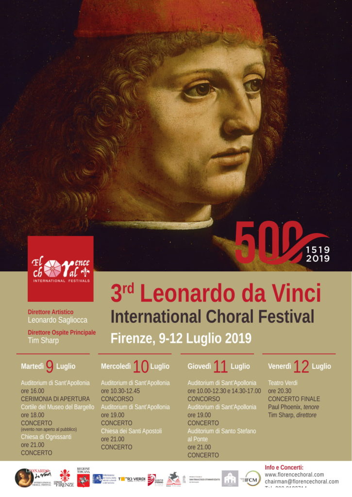 Avrà ufficialmente inizio martedì 9 luglio alle ore 16 nell'Auditorium di Sant'Apollonia, il 3° Leonardo da Vinci International Choral Festival, organizzato dall’Associazione ‘Florence Choral’ presieduta e diretta dal basso-baritono fiorentino Leonardo Sagliocca.