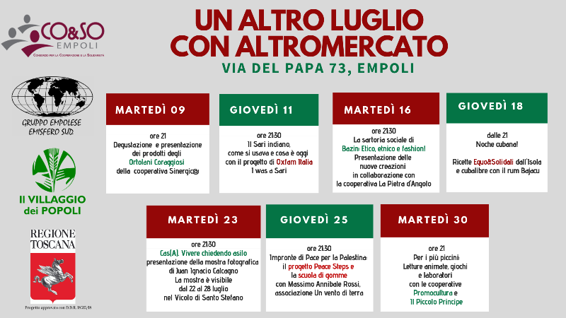 Le serate del luglio empolese si arricchiscono del programma di eventi realizzato da CO&SO Empoli, Gruppo Empolese Emisfero Sud e dalla cooperativa Il Villaggio dei Popoli ad Altromercato. La bottega di via del Papa, 74 a Empoli, ospiterà infetti serate che avranno come protagonista la cooperazione locale e internazionale.