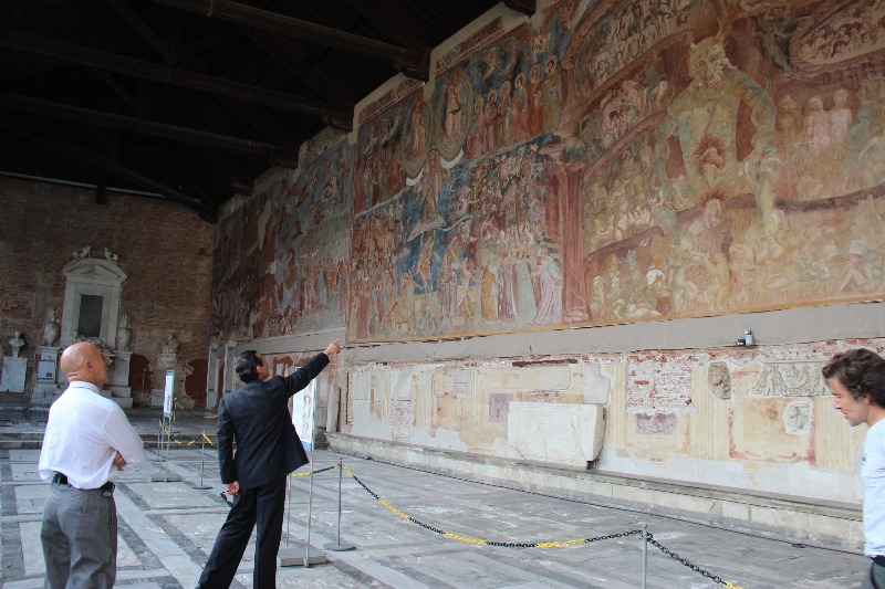 Gli attori Alessio Boni e Roberto Ciufoli, accompagnati dal produttore Massimiliano La Pegna, hanno fatto visita alla Piazza dei Miracoli, soffermandosi ad ammirare il Trionfo della morte di Buffalmacco in Camposanto Monumentale. L'attore Boni, in città per le riprese della fiction tv su Enrico Piaggio fondatore dell'omonima casa motociclistica, è rimasto colpito dai colori dell'affresco, oltre che dalla drammaticità delle scene ritratte. I restauratori presenti sul posto, lo hanno accompagnato nella visita, ripercorrendo la storia del salvataggio dell'affresco, dai danneggiamenti subiti a causa del bombardamento, fino al recente ricollocamento grazie alle più avanzate tecniche di restauro.