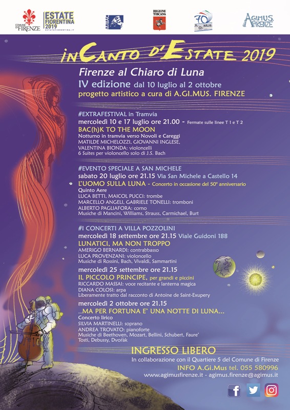 Questa edizione del Festival InCanto d’Estate celebrerà il cinquantenario dell’allunaggio, da cui il titolo “Bac(h)k to the Moon”. L’appuntamento successivo sarà il 20 luglio alle 21.15 presso la Chiesa di San Michele a Castello (Via di San Michele a Castello, 14), dove il Quintetto di fiati Quinto Aere terrà un concerto ispirato proprio all’anniversario dello sbarco dell’uomo sulla Luna, nel giorno esatto della ricorrenza.