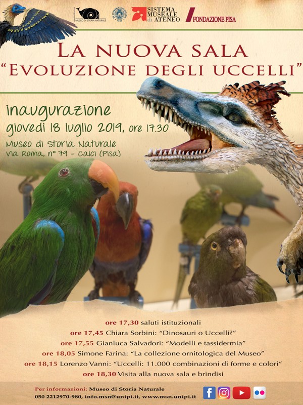 Il giorno 18 luglio 2019, alle ore 17.30, apre al pubblico la nuova Sala sull’Evoluzione degli Uccelli del Museo di Storia Naturale dell'Università di Pisa.