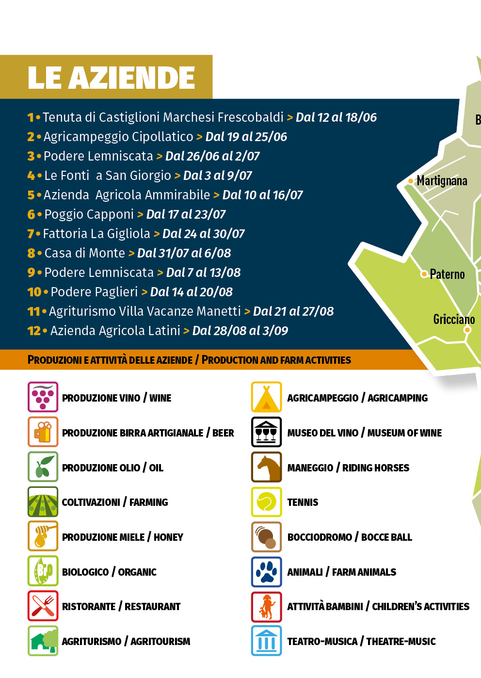 Tutti i giorni: visita azienda, passeggiate, merende. Con prenotazione degustazione vini, cena dall’orto, pedalata nella natura in e-bike. Tutti i giorni: visita azienda, passeggiate, merende. Con prenotazione degustazione vini, cena dall’orto, pedalata nella natura in e-bike. Mercoledì 10/7 •h 18 teatro per ragazzi, cena di casa nostra; giovedì 11/7 • h 20 un’esperienza territoriale di finanza solidale a cura di Microcredito Val di Pesa. Venerdì 12/7 • h 20 cena a tema con sorpresa; sabato 13/7 • h 17 passeggiata e racconti di un vignaiolo, h 20 musica dal vivo; domenica 14/7 • h 18 godere la campagna insieme con cantastorie, cena a tema; lunedì 15/7, mar 16/7 • dalle h 17.30 tempo di relax in giardino e assaggi prime uve in vigna; cena.